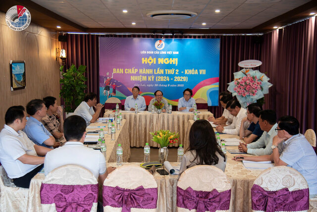 + Giải quốc tế Vietnam Series với quy mô và cấp độ thấp hơn sẽ luân phiên tổ chức tại các tỉnh, thành phố khác nhau nhằm lan toả phát triển phong trào tập luyện và tham gia thi đấu Cầu lông trong cả nước cũng như có cơ hội để quảng bá hình ảnh du lịch Việt Nam. Lãnh đạo Liên đoàn chủ trì hội nghị + Đảm bảo quy trình thẩm định về cơ sở vật chất, thuận tiện đường bay đưa đón, nhân lực và kinh tế để đáp ứng công tác tổ chức các sự kiện quốc tế.+ Đảm bảo lựa chọn địa điểm, xây dựng chương trình kế hoạch tổ chức hệ thống các giải đấu quốc gia ngày một chuyên nghiệp.- Hỗ trợ vận động viên trẻ triển vọng: Văn phòng và Ban chuyên môn cần xây dựng đề án phát triển vận động viên trẻ, kế cận theo lộ trình và đề xuất phương án hỗ trợ chi tiết.- Đào tạo trọng tài và huấn luyện viên quốc tế: Tiếp tục chú trọng công tác đào tạo cử các trọng tài, huấn luyện viên có trình độ tiếng anh tham gia học tập và nâng cấp tại các khoá học, hội thảo quốc tế do BWF và BA tổ chức.- Hợp tác với Trung tâm Doping: Đồng ý chủ trương hợp tác với Trung tâm Doping tại các giải đấu quốc gia và quốc tế, Văn phòng và Ban chuyên môn chủ động kế hoạch phối hợp hoạt động hàng năm.- Bổ sung nhân sự vào Ban Thường vụ: Trên cơ sở thống nhất 100% (17/17) Uỷ viên tham gia hội nghị, Ban Chấp hành nhất trí về việc bổ sung đồng chí Nguyễn Huy Thắng - Uỷ viên Ban Chấp hành - Chủ tịch Liên đoàn Cầu lông Hà Nội vào Ban Thường vụ Liên đoàn Cầu lông Việt Nam nhiệm kỳ VII (2024-2029).- Tài chính của Liên đoàn: Thông qua báo cáo tài chính của Liên đoàn năm 2024 và đến tháng 9 năm 2025, nguồn lực tài chính ổn định, các hoạt động của Liên đoàn thu hút được các nguồn tài trợ trong và ngoài nước, giá trị tài trợ duy trì bền vững.- Hội nghị Ban Chấp hành năm 2026: Thống nhất tổ chức hội nghị Ban Chấp hành năm 2026 tại Bắc Giang theo đề nghị đăng cai của Liên đoàn địa phương.- Chương trình thăm quan SEA Games 33 tại Thái Lan: Nhất trí tổ chức chương trình cho các Uỷ viên Ban Chấp hành nhiệm kỳ VII (2024-2029) đi thăm quan, học tập, trao đổi tại SEA Games 33 vào tháng 12 tại Thái Lan. Toàn cảnh các Uỷ viên tham dự hội nghị - Đề xuất hợp tác và vận hành Trung tâm Cầu lông tại TPHCM: Hai bên (Liên đoàn Cầu lông Việt Nam và Hiệp hội Cầu lông Hàn Quốc) cần trao đổi và làm việc trực tiếp về đề xuất của Hiệp hội Cầu lông Hàn Quốc tại Việt Nam về việc xây dựng và vận hành Trung tâm Cầu lông tại Thành phố Hồ Chí Minh. Văn phòng chủ động thông tin phía bạn, lên lịch, dự kiến thời gian lãnh đạo hai Liên đoàn làm việc cùng với lãnh đạo Liên đoàn TPHCM và báo cáo tình hình với Chủ tịch Liên đoàn khi có kết quả.- Thành lập và phân công nhiệm vụ Văn phòng và các Ban chức năng: Thống nhất với báo cáo dự kiến thành lập và phân công nhiệm vụ Văn phòng và cá Ban chức năng, gồm: Văn phòng - Ban chuyên môn; Ban Giáo dục và phát triển; Ban Vận động tài trợ - Tài chính; Ban Đối ngoại; Ban Thi đua khen thưởng và kỷ luật; Ban Thông tin và truyền thông. Hội nghị đã thống nhất cao các vấn đề trên, mỗi cá nhân uỷ viên Ban Chấp hành nhiệm kỳ VII (2024-2029) đều thể hiện tinh thần, trách nhiệm trong việc xây dựng và phát triển phong trào Cầu lông Việt Nam nói chung và tại các tỉnh, thành nói riêng. Ghi nhận tinh thần đó, Chủ tịch Liên đoàn bày tỏ sự cảm ơn chân thành tới sự có mặt tham dự gần như đầy đủ của các Uỷ viên.